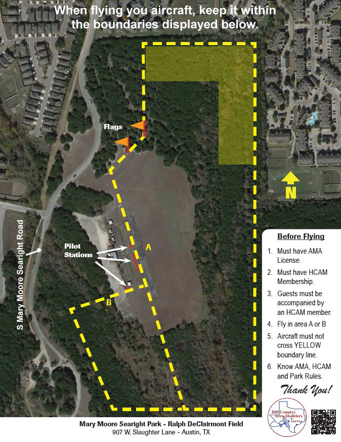 Reference the map to the right to see where you can fly your aircraft. Aircraft generally fly in zone A. Take care not to fly over the apartment complex to the East of the field. Helicopters and drones generally fly in zone B.